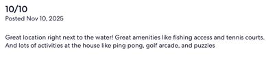 "Great location right next to the water! Great amenities iike fishing access and tennis courts. And lots of activities at the house like ping pong, golf arcade and puzzles"